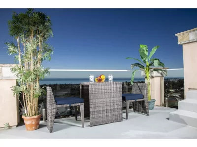 The Allspace Balcony Conversation Aluminum Set is perfect to relax in style and comfort of your front porch, backyard, and balcony. With a dainty and subtle frame, the 3 piece set provides a compact, space-saving element. The set includes Sunbrella fabric cushions and powder coated aluminum frame, all weather resistant artificial wicker with UV protection to sustain premium quality.Sunbrella fabrics provide durable and long-lasting quality that are easy to clean with built-in UV protection. Engineered to be mold, stain, and water resistant for an all-seasonal use.