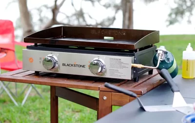 Take the Blackstone 22” Gas Tabletop 2 Burner Griddle anywhere outdoors for big and versatile meals. Equipped with two independently controlled heat zones. You’ll have full control of the 330 sq. inch plate for simultaneous low and high heat cooking.nnThe two “H” style burners provide even heat distribution for optimal cooking across the whole griddle. Stable on any surface from grassy hills to muddy terrain, so you can eat up delicious burgers, hot dogs, steaks, eggs, and more! No stress – easy to clean and feeds the whole family.