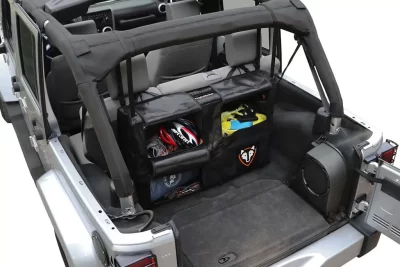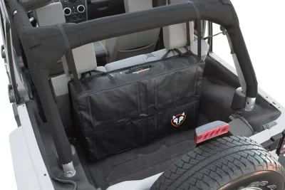 Weatherproof storage for your Jeep Wrangler’s unused space! The Rightline Gear Trunk Storage Bag holds recovery gear, clothing, towels, groceries, first aid kits, roadside equipment, snacks, etc. The bag is angled to perfectly fit behind the Wrangler’s rear seat and features (4) zippered compartments, (2) hard plastic shelves, an inner mesh pouch, quick release buckle straps, and a carry handle. A hard plastic insert in the top of the bag provides shape and structure. The bag is made from tough PVC Coated Mesh that is reinforced for strength and UV protection. Use the Trunk Storage Bag for off-roading, road trips, and everyday storage.